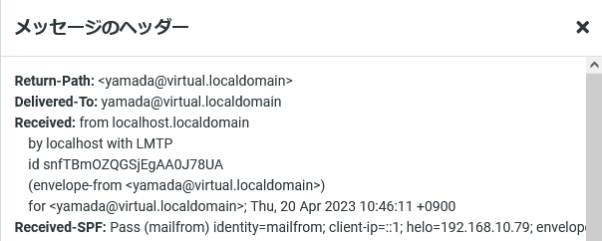 Received-SPF: Pass (mailfrom) identity=mailfrom; client-ip=::1; helo=192.168.10.79; envelope-from=yamada@virtual.localdomain; receiver=<UNKNOWN>