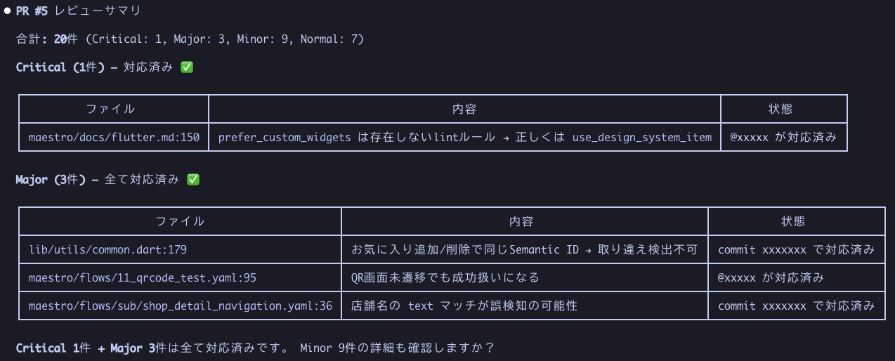 サマリ表示後にClaudeが「Minorの詳細も確認しますか?」と聞いてくれるので、そこからCritical+Majorだけ詳細表示したり、全件の内容を確認したりと、段階的に掘り下げることもできます。