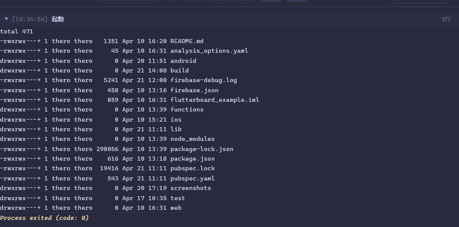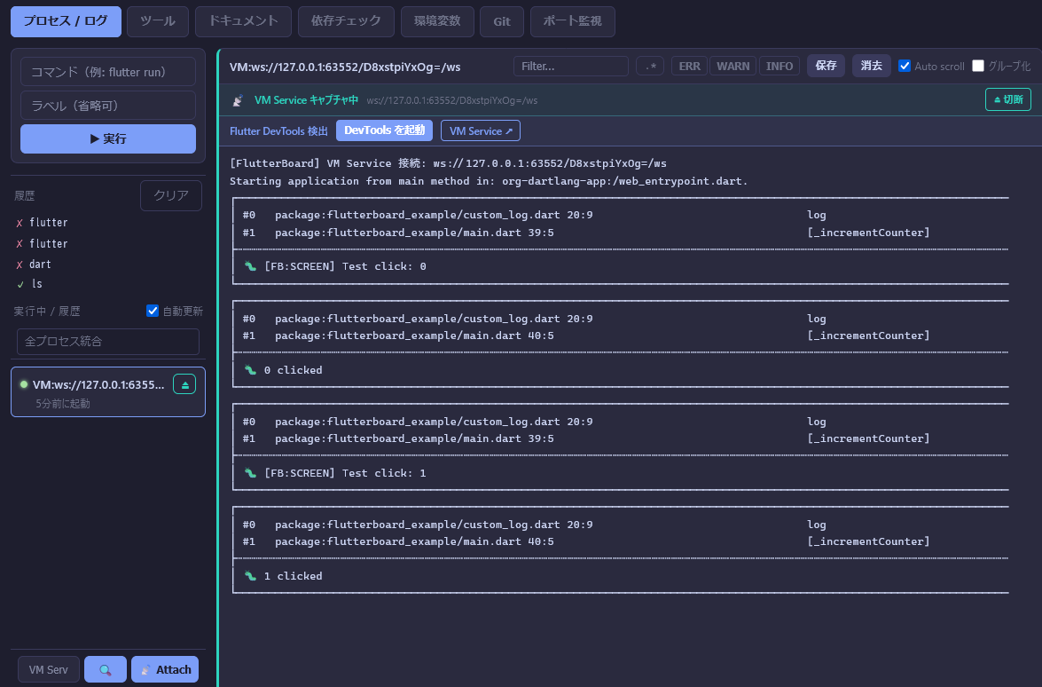 FlutterBoardでフォルダを開いて、プロセス/ログをクリック。