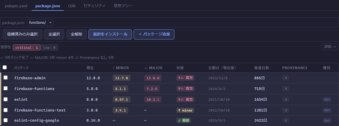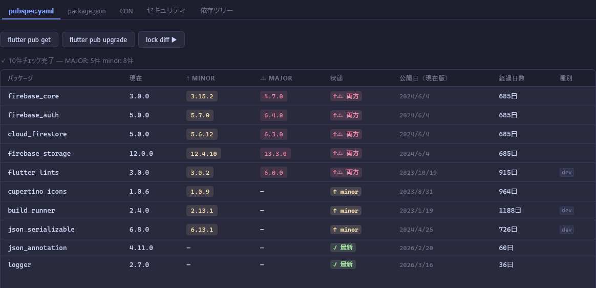 もう1つの目玉みたいな機能です。 いきなりアップデートよりも、まずは状態を一覧で見たい事が。 そんな時に依存チェックを押して、直下のpackage.jsonまたはpubspec.yamlを見る事が出来ます。 早速結果。