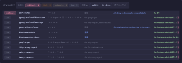 ついでに、セキュリティボタンでは、npm auditやOSV.DEVを使った脆弱性チェックなんかも可能です。