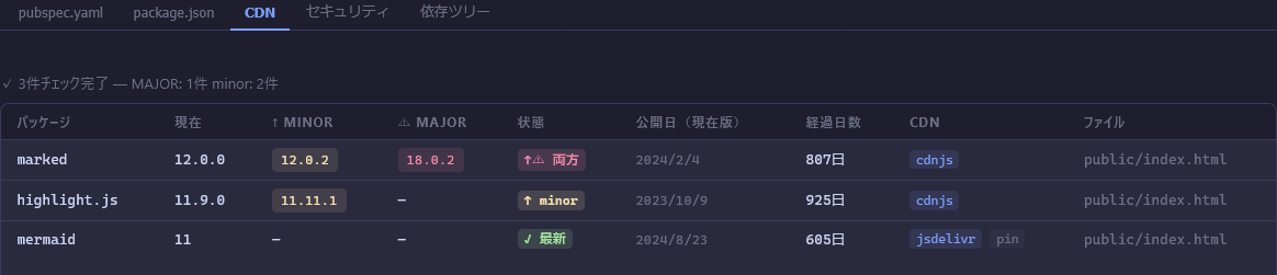 pubspecもpackageも綺麗に出せました。マイナー、メジャー両方が表示出来ます。 変わり種としては、CDNを利用しているhtml内の表記にも対応しています。こちらは流石に手で修正する必要がありますが。