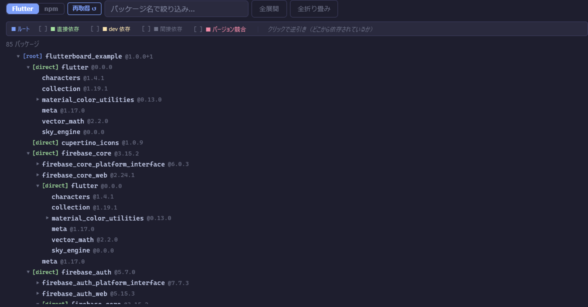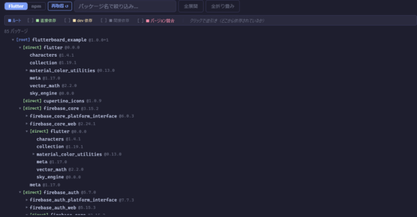 Flutterやnpmの依存ツリーを見る事が出来ます。